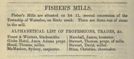 The Waterloo township directory of 1864 shows the Bretz family still living on the old homestead, on Lot 12, concession 2. It also lists the businesses found in Fisher Mills at the time, right on their doorstep.