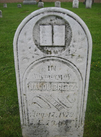 On July 11, 1843, at age 76, Jacob Bretz senior passed away. He was buried at the Wanner Mennonite cemetery not far from his homestead, and at the church where he worshipped for many years. The gravestone looks to have been replaced at some point in more modern times.