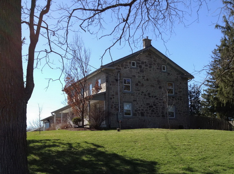 Where the original farmhouse was located remains somewhat of a mystery, as it was of log construction and is now long gone. It might have been in the very location as the later stone home (see below). This photo is of the Christian Schneider house which dates from 1807 and would have looked similar.